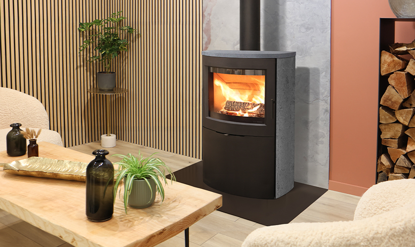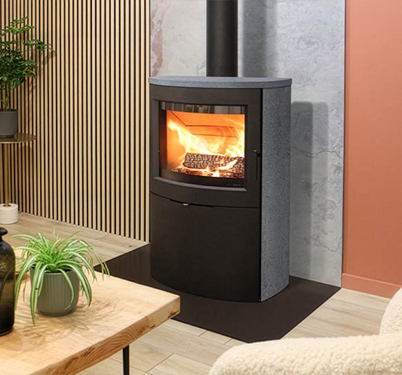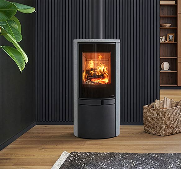 Le poêle JAZZ L et son habillage en pierre d’accumulation JERSEY. Cet habillage en pierre naturelle accumule la chaleur pour…